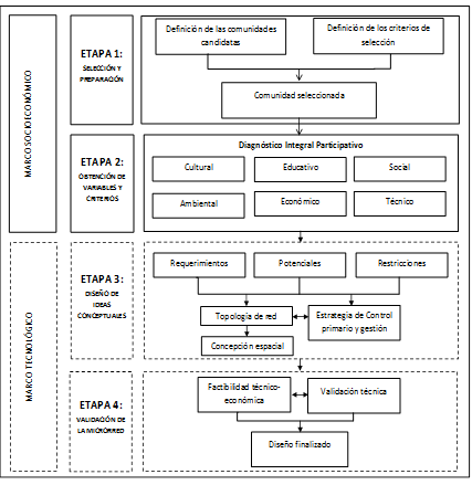 Los resultados obtenidos del diagnóstico territorial participativo permiten diseñar conceptualmente los elementos fundamentales que pudieran conformar la micro red, en concordancia con las necesidades y realidad particular de la comunidad. Así mismo, se deberá prediseñar la estrategia de control y gestión de red en estrecho vínculo con la idea conceptual de la micro red, teniendo en cuenta los siguientes aspectos: