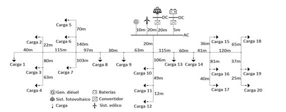 Así entonces, una micro red con alta penetración de FRE resulta más compleja de controlar que una compuesta por fuentes de generación despachables como los Grupos Electrógenos, gasificadores o hidroeléctricas entre otros [25]. Así mismo, las potencias y proporciones de estas generaciones despachables y no despachables dentro de la micro red provocan distintos tipos de toma de decisiones en cuanto al control. Es por esto que es necesario definir la topología de red que se pretende implementar en la micro red, con las características de los generadores, cargas y distancias entre ellos, como se muestra en la figura 5.