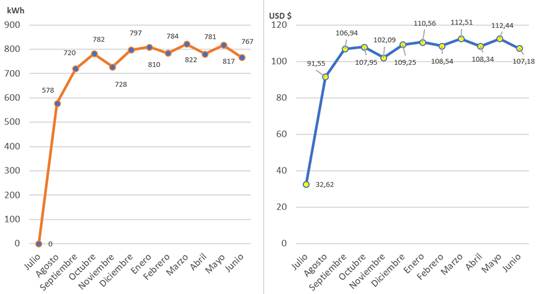 El consumo energético otorgado por la gerencia, responde al consumo en el periodo de doce meses durante el cual se alcanzó un consumo total de 8386 kWh adquiriendo un valor de pago por consumo total de $1209,91. La figura 2, presenta el mes de julio como nula actividad energética por fallos de medición del medidor de luz, sin embargo al pago por consumo registró un valor de $32,62 por un determinado uso no medido. En promedio durante el periodo registrado, la demanda energética diaria se estableció en 22,98 kWh con unatarifa, relacionando elpago total junto al consumo total, de 0,1442 $/kWh.