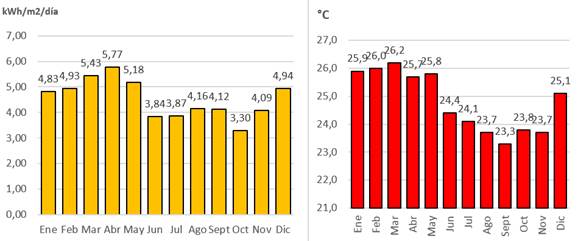 Por medio del uso del SIG en PVsyst fue estalecida la IGH y la temperatura ambiente en la que se encuentra la instalación, la figura 3, muestra el comportamiento de dichas variables en donde se demuestra que diciembre juntos a los cinco primeros meses del año corresponden a ser los de mayor irradiación a su vez que los más calurosos, estableciendo valores promedio en IGH de 4,54 kWh/m2/día y de temperatura en 24,8 °C.