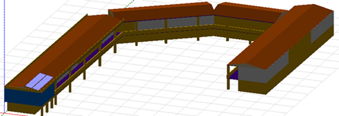 La versión en la cual se simuló el proyecto fue PVsyst 7,2, en la cual se tomó en cuenta la fijación de los paneles en el techo de las instalaciones, el mismo software por la ubicación del proyecto estimó como óptimo 5° de inclinación, sin embargo, dicho valor representa una mínima elevación la cual impide que la lluvia limpie naturalmente el polvo y otros residuos de los paneles reduciendo significativamente el rendimiento del sistema, para Ecuador la inclinación de los paneles debe ser 10° como mínimo teniendo poco impacto sobre la eficiencia del proyecto debido a la poca diferencia entre inclinaciones [16, 17]. El techo a utilizarse presenta una inclinación de 12° con -89,8° de azimut, en la figura 4, muestra el modelo 3D de las instalaciones, siendo el espacio azul las instalaciones a optimizar: