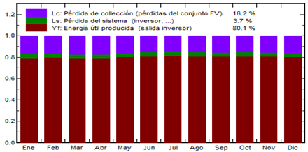 El tamaño óptimo del inversor fue estimado por PVsyst a través de los datos previamente calculados, el mismo posee como potencia nominal 6,13 kWp y 9 kWp de potencia máxima, teniendo como voltaje máximo 1000 V y 54 A de corriente máxima con una eficiencia del 98%, lo cual no representa problemas de compatibilidad con la conexión serie-paralelo de dos stringsde nueve paneles, puesto que se encuetra en los rangos admisibles. El rendimiento del SFV está representado en la figura 5, en la que muestra pérdidas del sistema, así como su proporción de rendimiento con valor de 0,801.
