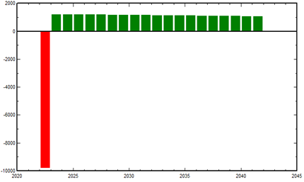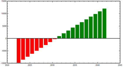 La simulación reveló un flujo de caja anual prácticamente constante desde el inicio del primer año de operación, como se puede apreciaren la figura 6. Este patrón constante sugiere una estabilidad financiera a lo largo del tiempo, proporcionando una indicación positiva de la solidez del proyecto. La consistencia en el flujo de caja anual desde el principio ofrece una proyección financiera sólida y confiable. En consonancia con este análisis, el flujo de caja acumulativo presentó valores positivos y alentadores a partir del año once, como se evidencia en la figura 7. Este hito marca un punto crucial en el proyecto, indicando la generación de ingresos acumulativos que superan los costos asociados.