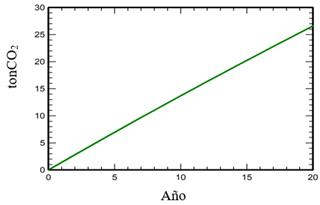 El impacto ambiental debido a la sustitución de la fuente de electricidad es positivo, siendo que el SFVCR muestra 0 emisiones emitidas al ambiente, mientras que durante los 20 años de vida útil que posee son evitadas 26,59 toneladas de CO2 al ambiente generadas por fuentes convencionales, con un promedio anual de 1,33 tonCO2 a razón específica de 0,182 tonCO2/kWp/año tal como lo demuestra la figura 8.