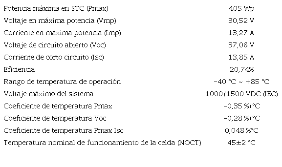 (1)Para este estudio se optó 0,722 como valor del FPS, dicha variable unifica pérdidas por cableado, temperatura, polvo, etc [13, 14] y 0,98 como eficiencia del inversor debido a la similitud entre inversores actuales, mientras que las HSP corresponden al valor promedio de IGH relacionado con una irradiancia de 1 kW/m2. Con la potencia del SFVCR definida se estableció el módulo fotovoltaico, del cual en la tabla 1, se muestran sus características: