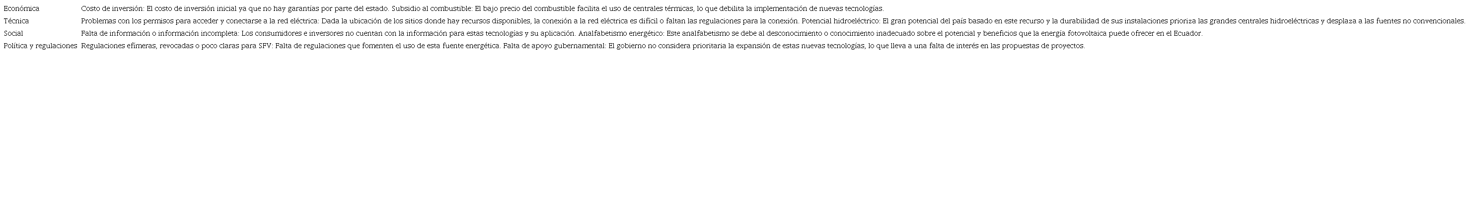 A pesar del gran potencial solar ecuatoriano, los SFV no son tratados como potencial suministrador de energía eléctrica al existir barreras tanto económicas como políticas que retrase su participación en la matriz energética nacional. En tiempos actuales, existe un reducido número de empresas que favorecen la implementación de SFVs ya quelos problemas no se limitan a los anteriormente mencionados, habiendo barreras técnicas y sobre todo sociales; a continuación, en la tabla 2, son mostradas dichas barreras que impiden una mejor penetración de la energía fotovoltaica.