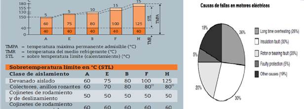 Está relacionado con condiciones anormales de trabajo que provocan sobrecargas que elevan la temperatura del motor a límites no permisibles de acuerdo a su clase de aislamiento. En los últimos años se han desarrollado dierentes métodos para el monitoreo de la temperatura de los enrollados del motor [1, 2, 3, 4, 5]. Los motores de la fábrica de cementos estudiada son de Clase F. En la figura 1, se puede ver que este tipo de aislamiento soporta una sobre temperatura por encima de la ambiente, de 115 grados centígrados, aunque las protecciones deben de disponer de un margen de seguridad de 15 grados. En la figura también se observan las causas fundamentales de fallas en los motores eléctricos. Las dos primeras, que suman un 56%, están relacionadas con trabajos sostenidos por encima de la temperatura máxima permisible de trabajo del motor.