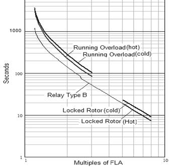 En la figura 2, se muestran dos curvas, en frío y en caliente, lo que es evidente por el hecho de que no es igual la temperatura que alcanza un motor ante una sobrecarga si las condiciones de trabajo anterior a la misma corresponden a la temperatura ambiente (motor frío), o caliente (temperatura normal de trabajo en condiciones nominales). Además de las curvas de sobrecarga del motor, es necesario conocer el Factor de Servicio (Ambos parámetros a suministrar por los fabricantes del motor).