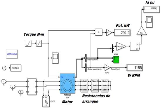 Con la información suministrada siempre es posible modelar el arranque del motor con resistencias en el rotor que se van eliminando a medida que el motor gane en velocidad. Se muestra en la figura 3, como ejemplo, el esquema del modelo en MATLAB elaborado para la modelación del arranque del motor que mueve el accionamiento Airliftsilos, cuando se ha adicionado en el rotor una resistencia de arranque referida al estator de 33 Ohms en 12 pasos de 2.75 Ohms que se van conmutando cada segundo para simular el efecto de ir quitando a velocidad constante la solución salina, que debe eliminarse en un tiempo de 12 segundos.