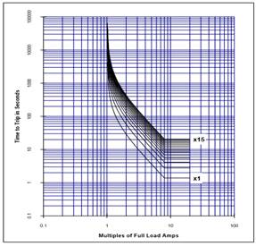 La curva de sobrecarga responde por el calentamiento del motor durante atascamiento, aceleración y en marcha, tanto en el estator como en el rotor. El parámetro de Arranque de Sobrecarga decide donde comienza la curva de sobrecarga en marcha cuando el motor entra en una condición de sobrecarga. Esto es útil para motores de factor de servicio, ya que permite que el nivel de arranque sea definido. La curva es cortada, efectivamente, a nivel de los valores de corriente bajo este arranque. El relé suministra un conjunto de 15 curvas de protección para ser utilizadas de acuerdo con las curvas de daño del motor a analizar. En el caso de que una cualquiera de estas curvas coordine con las curvas de rotor bloqueado y de marcha normal, entonces la curva es seleccionada y constituye una curva de disparo continua. En caso de no conocerse las curvas de daño se aconseja utilizar la curva No. 4. En la figura 5, se muestran estas curvas que se seleccionan por su número correspondiente. En el caso en que ninguna de estas curvas se pueda ajustar con las curvas de daño del motor el usuario puede utilizar la opción de utilizar una curva definida por él para lograr una protección adecuada.