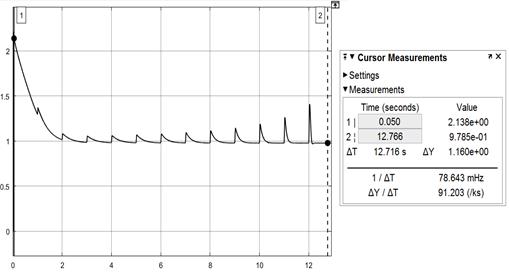 En la fábrica no se dispone de métodos que permitan confirmar los parámetros de los motores, por lo que se toman los valores de las pruebas de fábrica. Con esos valores de impedancia se modela la corriente de arranque y resulta el comportamiento que se muestra en la figura 6, en la que se puede ver que la corriente de arranque inicial es ligeramente superior a 2pu, pero en un tiempo muy corto cae por debajo de 1pu, lo que justifica la consideración de que, si se asegura la resistencia de arranque de 0,27Ohms en el rotor y se elimina a velocidad constante en un tiempo similar al modelado de alrededor de 12s, prácticamente el motor no consume capacidad térmica durante el arranque. El valor calculado a partir de la corriente de arranque se corresponde con 0.92%.