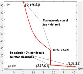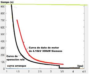 El valor de corriente de 4.21pu de corriente de rotor bloqueado se calcula a partir de la prueba de rotor bloqueado que es suministrada por el manual del suministrador del motor. Con los cálculos anteriores se puede proteger al motor en el caso de que se bloquee el eje durante el arranque no obstante para la protección del motor en condiciones normales no se dispone de la curva de daño. En el caso del motor analizado es muy importante que la curva de operación del relé para estas condiciones se seleccione con cuidado, ya que la relación de la tensión nominal/HP en el eje motor resultan mayores de 10, (6000/(300/0.746)=14.92, siendo considerado estos motores limitados por el estator. Para la selección de la curva del relé térmico en la zona de trabajo normal del motor, normalmente por debajo de 3pu de corriente se parte de la curva de daño de un motor Siemens de 300kW, 4.16kV suministrada por esa firma, que se muestra en rojo en la figura 7.