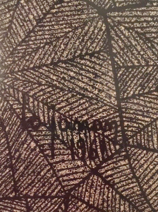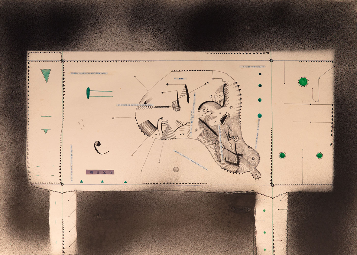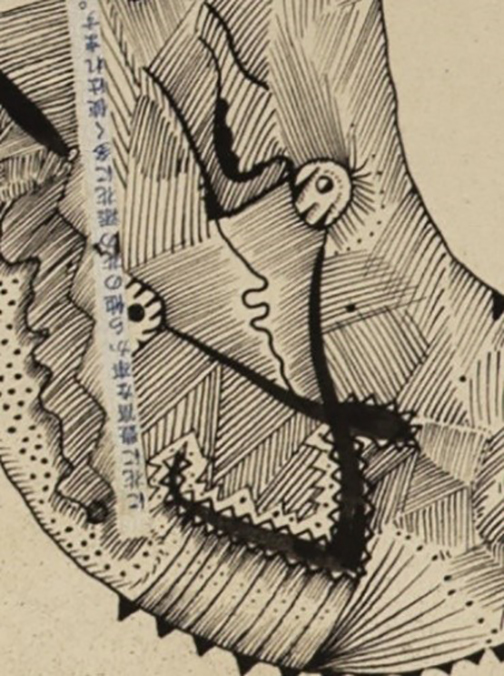 Mas, se observarmos os detalhes da figura de perto, percebemos um mapa que se assemelha a um arrozal e em seu interior os ideogramas japoneses se incorporam à forma da figura: