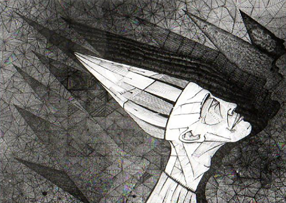 A Figura 2 repete algumas constantes na série ponciana: a cabeça inclinada, o olhar fixo no vazio, uma preocupação por delinear de forma acentuada a boca dos personagens pintados e a presença de chapéus pontiagudos, denominados “cucuruchos” por Ponç. Essas cabeças repetem-se em gesto ancestral, que por sua vez, vincula-se a inúmeras possibilidades e embaralha-se em suas referências: a boca entreaberta como um portal, pronta para receber o sopro da vida, que caracteriza a incorporação, o chapéu icônico como uma forma de verticalização ou ascensão em busca do toque da divindade.