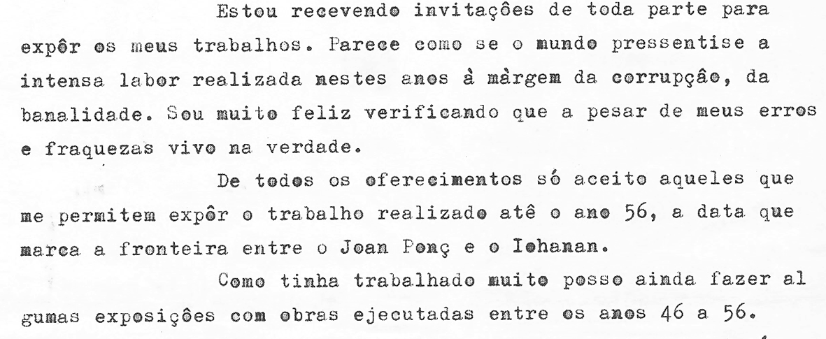 Me dedico a la enseñanza, como medio más apropiado para mantener mi libertad creadora, al margen de marchands, galerías y otras calamidades, que verifico van destruyendo paulatinamente incluso a los más resistentes. En la escuela, no hay distinción profesor-alumno; somos hermanos, soy un hermano que ha visitado un mágico lugar llamado creación y cuenta sus experiencias. Mi amor a los demás nunca fue tan intenso (PONÇ, 2009, p. 187).