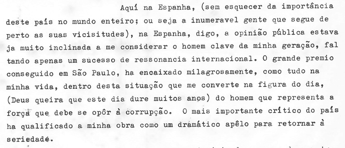 A correspondência de Ponç a Jeanete revela algumas questões caras ao pintor: o desejo de ser reconhecido, aliado à sua negativa em relação ao mercantilismo de sua obra. Daí que o grande prêmio da Bienal (Figura 5), de fato, tenha caído como uma luva, pois assinala seu reconhecimento em âmbito internacional como artista e homem, numa simbiose entre estética e ética, sustentada a ferro e fogo por Ponç durante sua carreira.
