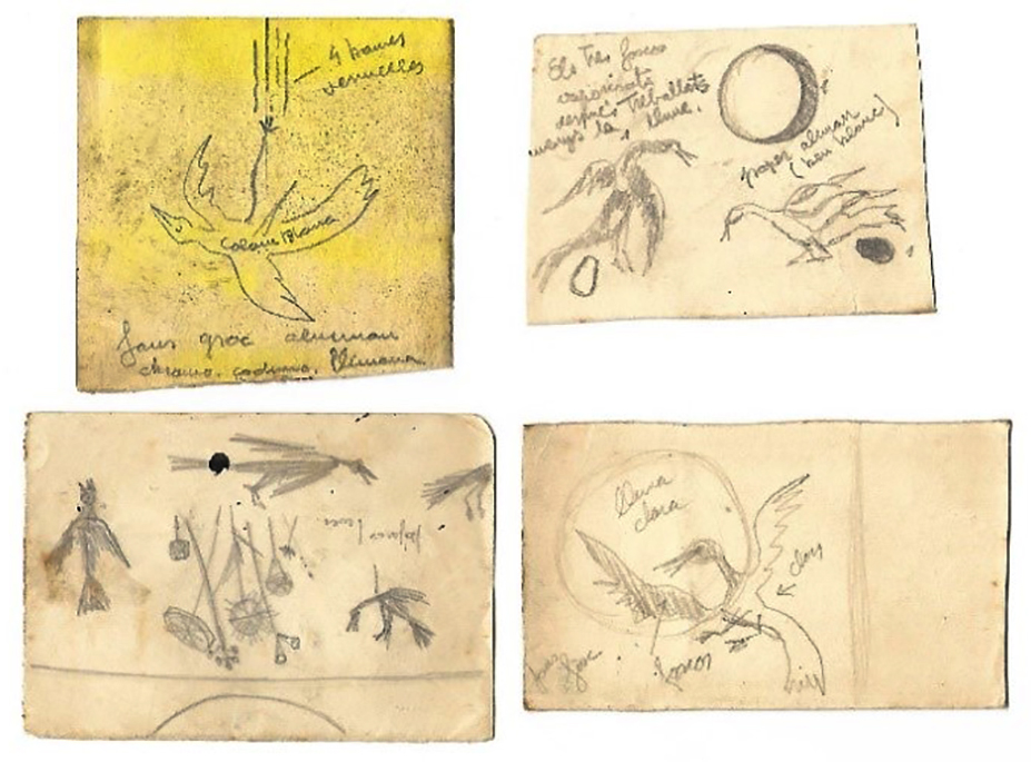 O exercício milimétrico e mínimo dos croquis em três séries poncianas - Instrumentos de tortura, Cabezas e Pájaros (Ocells) -, manifestam um método movido pela reflexão detida e pela inspiração intempestiva, misturadas, elas expõem uma criação quase ininterrupta, que pode brotar desde a observação contínua e prolongada da natureza, até a necessidade de sincronizar o visto com o imaginado (Figuras 6, 7 e 8).