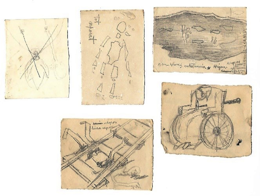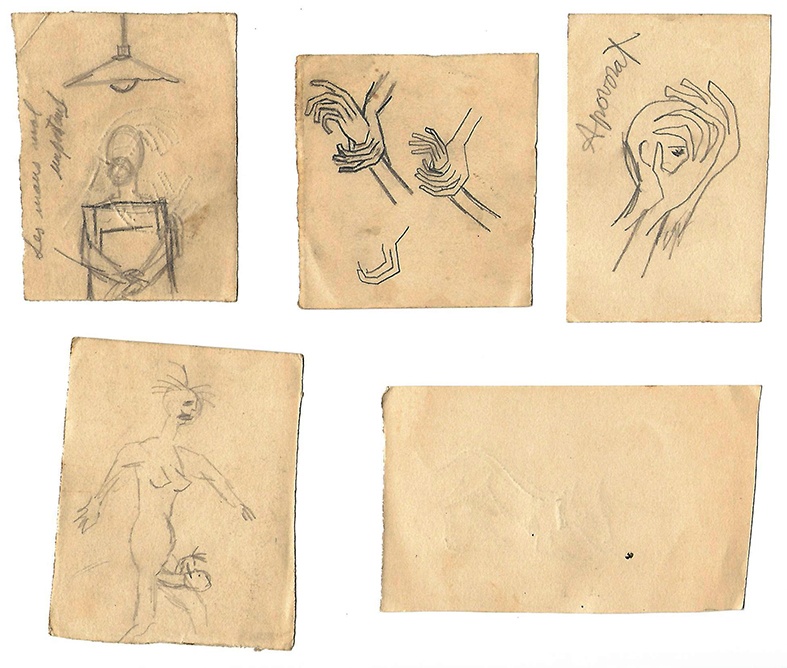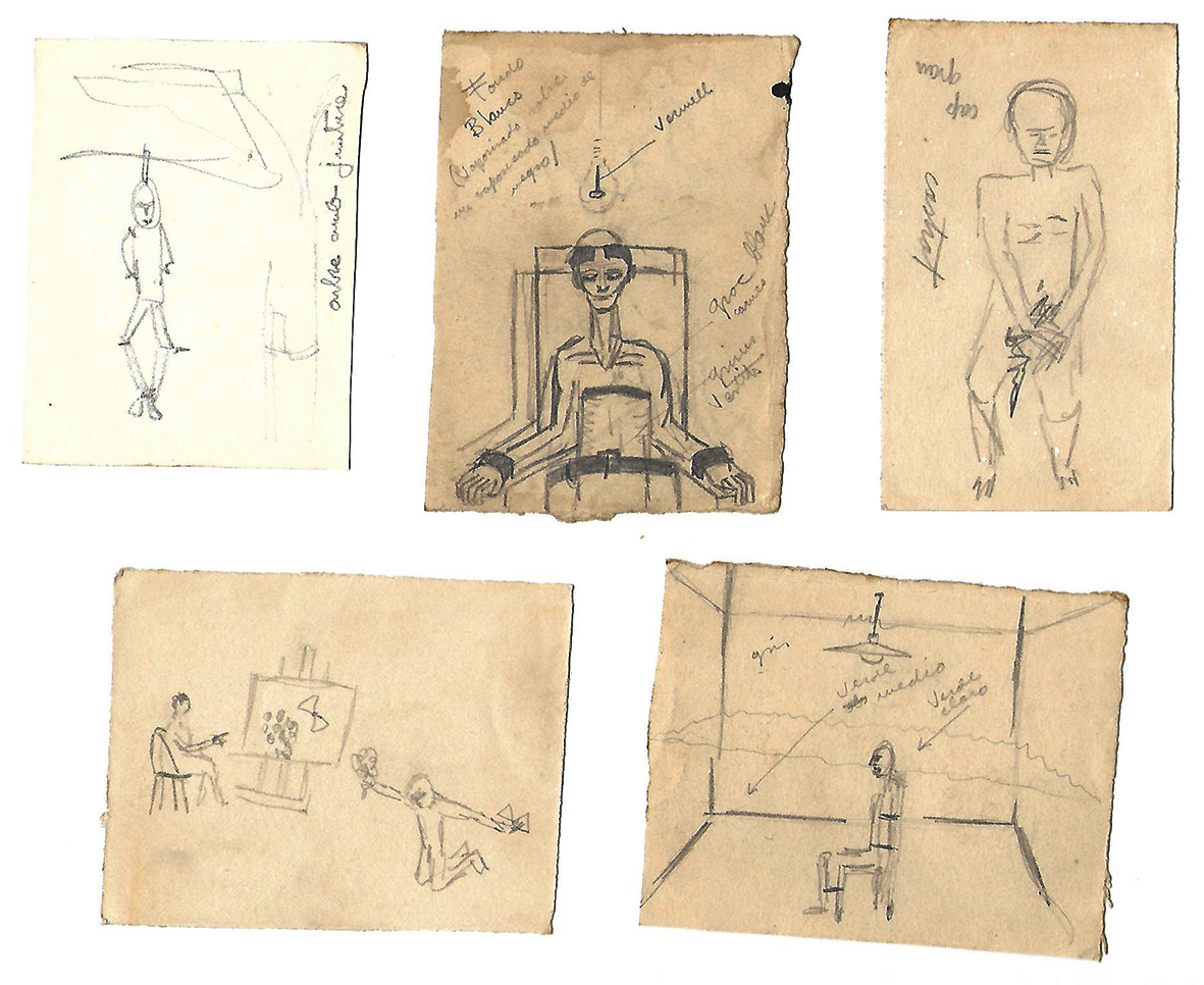 Por fim, vale a pena destacar que nos croquis de suas séries manifesta-se uma preocupação estética e teórica que surge em boa parte da obra do pintor catalão: a fragmentação do corpo. Um exemplo dessa inquietação são os desenhos acima e os que seguem abaixo (Figura 9), que nos mostram um corpo fraturado, em que a legenda “tot separat” (tudo separado) dá o tom da série, em que corpos aparecem torturados ou em partes: são mãos, pés e cabeças isoladas, violentas e apavoradas: