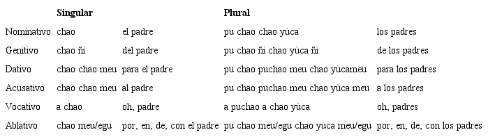 Valdivia (1606) define la categoría “nombre” del modo siguiente: “El nombre, y las demas partes de la oracion, que en esta lengua se declinan, no tienen mas de una terminación, como se vee en este nombre (chao) que significa Padre” (VALDIVIA 1606: 9r). En ello, hallamos la clasificación de una forma mapuche (chao) como una categoría de la tradición latina (procedimiento taxonómico) y su traducción al español, ‘padre’ (procedimiento traductológico). En seguida, el autor ofrece el paradigma de esa declinación (procedimiento distribucional), diferenciado, en primer lugar, por el accidente número (singular y plural):