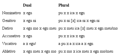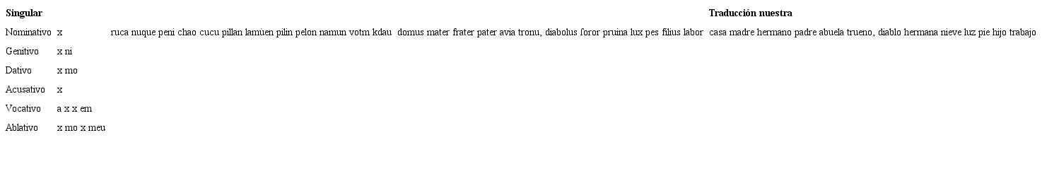 Por otra parte, Havestadt (1777) emplea el concepto de declinación para indicar que el nombre mapuche es indeclinable y explica la formación de palabras con partículas añadidas al inicio o al final de estas. En la distribución del paradigma nominal, el autor presenta los contenidos de una manera distinta a sus antecesores, pues parte de un término, que señala con el símbolo ‘x’, al que se suman las partículas: