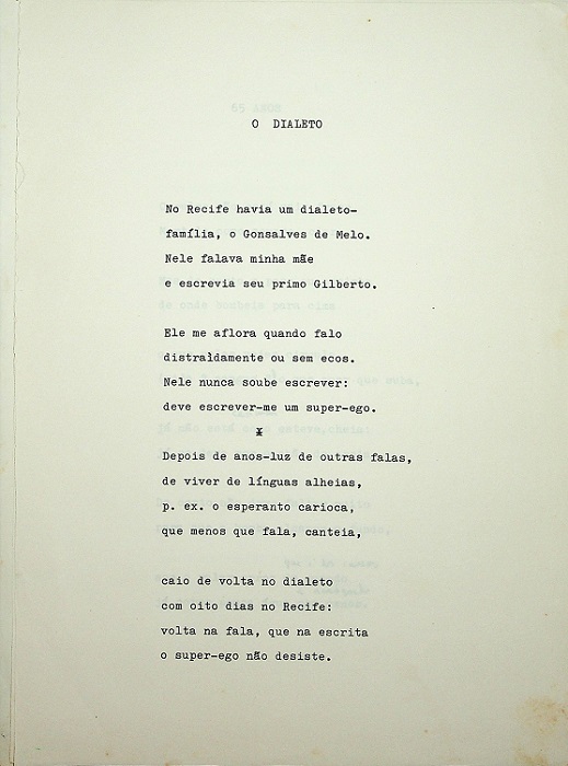 Fac-símile do poema inédito “O dialeto”. O original pertence ao espólio documental de João Cabral de Melo Neto, sob os cuidados do Arquivo-Museu de Literatura Brasileira, da Fundação Casa de Rui Barbosa. 9