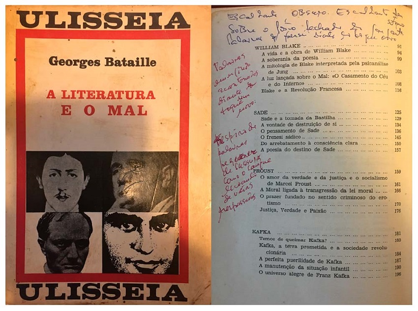 No entanto, algumas pistas podem sugerir o período em que os livros foram lidos por Hilda. No sumário do exemplar de A Literatura e o Mal (Figuras 1 e 2),10 de Georges Bataille, por exemplo, encontramos o rascunho do trecho de um poema, em caneta vermelha e azul, talvez o primeiro tratamento que mais tarde seria publicado no livro Sobre a tua grande face (1986), datado de “Casa do Sol, 1985, 1986”, indicando que o livro tenha sido lido por volta desta época.