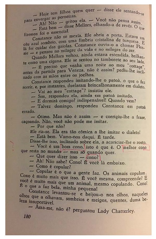 - Copular é o que a gente faz. Os animais copulam. Cono é muito mais que isso. É você mesma, compreende? E você é muito mais do que um animal, mesmo copulando. Cono! É o que a faz bela, minha pequena (LAWRENCE, 1985, p. 180, sublinhado indicando grifo de Hilda Hilst).