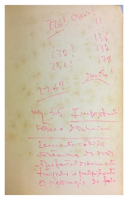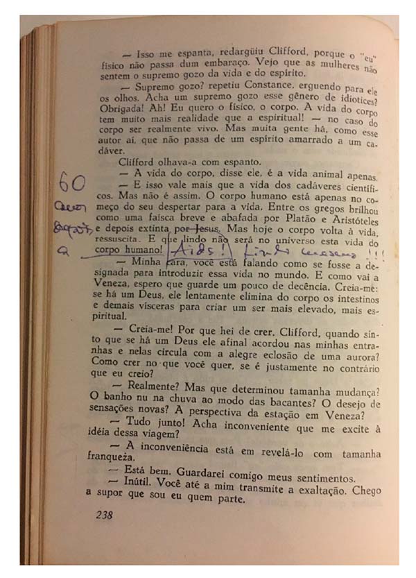 As inscrições ao longo do livro são feitas sobretudo em caneta azul ou vermelha, e, além dos comentários, encontramos, nas margens e invadindo a mancha gráfica, os sinais: ponto de exclamação; ponto de interrogação; asterisco; círculo; quadrado; sublinhado; ondulado; barra lateral; colchetes; barra no interior do texto. Um "Ah!" no trecho: “Beijou no ventre e no monte de Vênus, como o lugar mais próximo do útero onde estava o feto” (1985, p. 238).