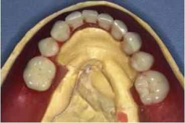 Enfilado dentario sobre modelo de trabajo con recorte de flanco lingual entre los premolares.