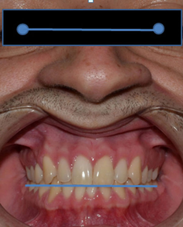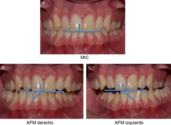 Una vez reunida la muestra, un investigador (investigador 1) separó a los participantes en 2 grupos: grupo 1, masticadores bilaterales; grupo 2, masticadores unilaterales. Para realizar la categorización del tipo de masticación, se generó un registro fotográfico estandarizado. Se ubicó a cada sujeto en un sillón dental para obtener 3 fotografías intraorales estandarizadas en iluminación y distancia. Se utilizó una cámara Canon A580, con flash incorporado, ubicada a 20 cm del filtrum nasal del sujeto y apoyada en un trípode ajustable en sentido vertical según la altura de cada individuo. Luego, usando un separador bucal, se expuso el campo a fotografiar. Con las fotografías obtenidas, se definió el plano bipupilar de cada individuo, el cual fue proyectado al plano oclusal (fig. 1) y se marcó con un lápiz sobre los incisivos inferiores el punto de entrecruzamiento con los incisivos superiores. Cuando no hubo coincidencia de líneas medias, la línea media inferior se proyectó sobre el incisivo superior como punto de inicio para realizar la medición del ángulo (fig. 2a). Además, se registró la posición de máxima intercuspidación y, guiando al sujeto a realizar lateralidades derecha e izquierda, se registraron las posiciones excursivas laterales hasta vis a vis (fig. 2b y 2c). A partir de los movimientos descritos y teniendo el plano bipupilar como referencia, se calcularon los AFM de cada lado.