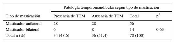 Un total de 56 sujetos (80,0%) fueron masticadores unilaterales y 14 (20,0%) masticadores bilaterales. En 34 sujetos (48,6%) se diagnosticó patología según RDC/TMD, mientras que en 36 individuos (51,4%) no se evidenció TTM. No hubo diferencia respecto al lado de masticación y presencia de TTM (p = 0,63). Se observó una alta tendencia entre la masticación unilateral y presencia de patología articular (grupos II y III, RDC/TMD) (p = 0,06).