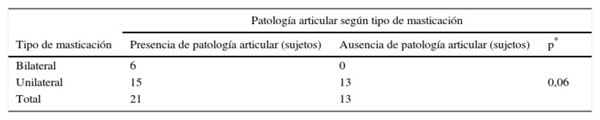 Al evaluar la relación de TTM de tipo articular según RDC/TMD (grupos II y III) y el tipo de masticación, no se observó diferencia significativa en la presencia de patología articular en masticadores unilaterales respecto a sujetos masticadores bilaterales (p = 0,06) (tabla 2).