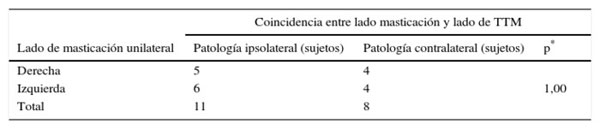 Al asociar la distribución ipsilateral o contralateral al hábito masticatorio unilateral, no se observó diferencia significativa en la presencia de patología temporomandibular ipsilateral al lado de masticación (p = 1,00) (tabla 3).