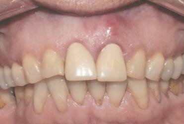 The rehabilitation was completed eight months after second-stage surgery. For aesthetic and biomechanical reasons, the tooth 1.1 was rehabilitated with a single-unit metal-ceramic crown. The rehabilitation of the implant 2.1 was developed with Phibo (Barcelona, Spain) system to perform a non-segmented screw metal ceramic crown. Torque of 25 N was applied, the access of the screw was closed with teflon and composite (Figure 6 - 7). Finally, the patient was left with a restrictive organic occlusal plane.