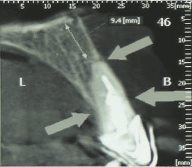 Type 2 B: Absence of the middle to coronal two-thirds of the labial bone plate of the extraction socket approximately 7mm to 9mm from the free gingival margin.