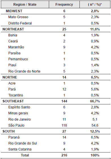 A total of 3,095 articles were published in the annals of the 2017 Meetings of the Brazilian Society of Dental Research. Only 216 (6.97%) studies dealt with issues related to Periodontics. Regarding the geographical location from where the studies were originated, the Southeast Region was responsible for 66.7% (144 papers) of the national publication, followed by the South Region with 12.5% (27 papers). Among the states located in the Southeast Region, São Paulo is responsible for 54.6% (118 papers) of the national publications. The distribution of publications according to the regions and states can be seen in Table 1.