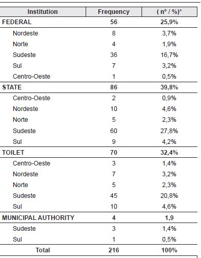 Table 2 shows the distribution of papers according to the type of institution (federal, state, private and municipal autarchy) and region. Research conducted in state institutions accounted for 39.8% of the national production, with most of them concentrated in the Southeast Region.
