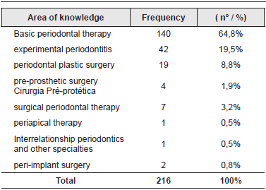 This article was developed by tabulating scientific papers presented at the Annual Meeting of the Brazilian Society of Dental Research (SBPqO). We examined any paper related to the specialty of Periodontics, one of the 23 fields of specialization in Dentistry. We opted for the survey in the annals of the SBPqO because its annual meeting is the largest in Brazil related to the subject, bringing together academics, post-graduates, professors and researchers, according to Cavalcanti (2004)11.