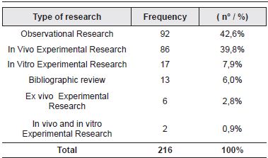 With reference to the types of research methods used, 42.6% (92 papers) were classified as observational studies, followed by in vivo experiments with 39.8% (see Table 5).