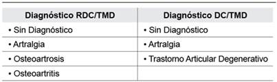 Los resultados para cada examen fueron analizados, a través de algoritmos ya establecidos, obteniéndose el diagnóstico de TTM Articular Inflamatorio para cada paciente según RDC/TMD y DC/TMD. Los diferentes diagnósticos se presentan en la Tabla 1.