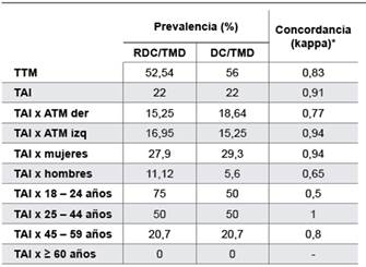 Resultados: La prevalencia de TAI para ambos criterios fue de 22%, con una concordancia casi perfecta (kappa=0,91). Al comparar las prevalencias de TAI por articulación, se obtuvo un grado de acuerdo sustancial (kappa=0,77) para la ATM derecha y un grado de acuerdo casi perfecto (kappa=0,94) para la ATM izquierda. Al comparar las prevalencias de TAI según género y edad se obtuvo una concordancia estadísticamente significativa en la mayoría de los casos.
