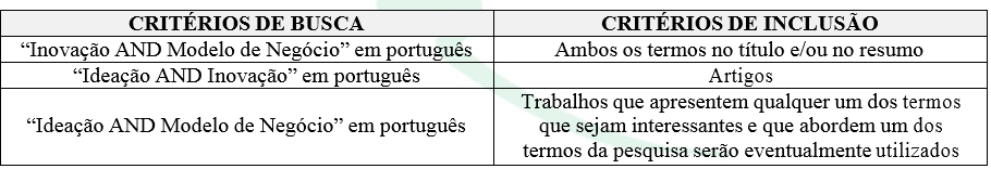 A busca foi conduzida nas bases da Spell (todas as bases), Doaj (todas as bases), Anpad (todas as bases) e Scopus (todas as bases).
