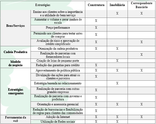 Em relação às estratégias empreendidas para a BoP no setor imobiliário, verificou-se que, das estratégias presentes na fundamentação teórica deste estudo, 18 delas foram executadas pelas empresas selecionadas para a pesquisa. Dentre elas, podem-se destacar a orientação e assessoria gerencial; a avaliação de risco e aprovação de crédito simplificado; o aproveitamento de políticas públicas; e o uso de internet.