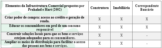 Os dados analisados de forma individual na seção anterior são discutidos transversalmente nesta seção de forma a verificar semelhanças e diferenças entre os casos. Nesse sentido, ao se analisar os elementos da infraestrutura comercial para o atendimento ao mercado da BoP, conforme apresentado por Prahalad e Hart (2002), evidenciou-se que são desenvolvidos, na íntegra, tanto pela construtora quanto pela imobiliária, conforme sintetizado no Quadro 1.