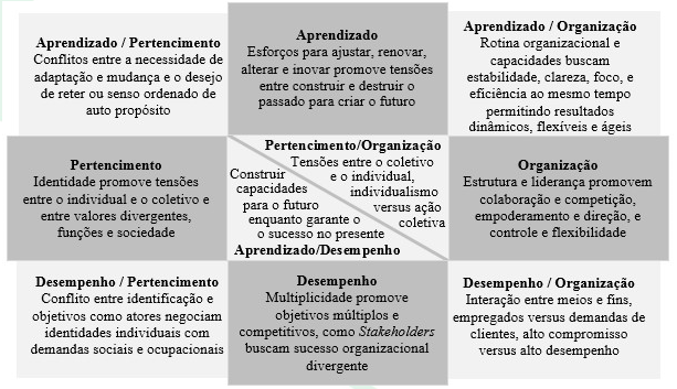 Ao analisarmos a Figura 2 percebemos que além dos quatro tipos de tensões mencionados, ainda existem “mistos” entre elas, como tensões entre desempenho e organização, que ocorrem, por exemplo, na interação entre os interesses dos colaboradores versus as demandas dos clientes; tensões entre aprendizado e desempenho, que ocorrem diante da necessidade de construção de capacidades para o futuro concomitantemente à manutenção do sucesso presente; tensões de aprendizado e pertencimento, que ocorrem devido às demandas de mudanças e o desejo de manter o senso do propósito organizacional (Smith & Lewis, 2011; Smith, Gonin & Besharov, 2013).