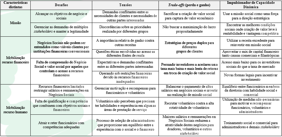 Como exemplo temos os negócios sociais, que devido à complexidade no gerenciamento dos conflitos e competição entre lógicas comerciais e sociais – e que por esta razão são denominadas organizações híbridas neste artigo - enfrentam desafios e tensões entre suas características essenciais, ou seja, a missão da empresa voltada ao atendimento e resolução de demandas sociais e a necessária mobilização de recursos financeiros e humanos para a manutenção do empreendimento (Battilana & Dorado, 2010; Pache & Santos, 2013).