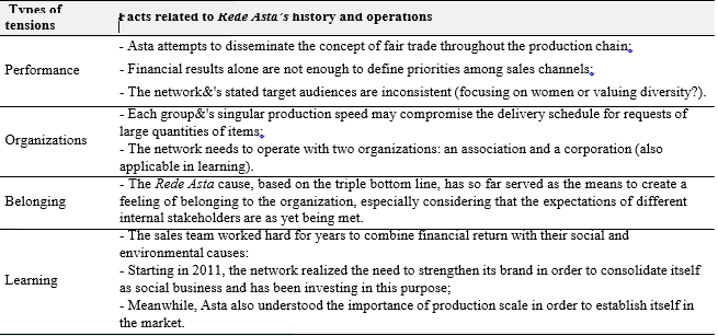 Tensões sobre (ii) pertencimento envolvem questões de identidade dos indivíduos e relacionamentos interpessoais, e estão relacionadas aos conflitos entre interesses individuais e coletivos, principalmente devido aos valores divergentes entre pessoas (Smith & Lewis, 2011; Smith, Gonin & Besharov, 2013). Este é o caso da Rede Asta, que tem como principal atividade a distribuição de produtos para casa e moda feitos à mão por grupos de artesãos de regiões de baixa renda do Brasil, e que possui grupos de produção diferentes em história, cultura e valores - alguns grupos são mais estruturados e formados por mulheres de classe média e outros são menores e formados por mulheres de comunidade de baixa renda. Desta forma, este empreendimento lida com diferentes estruturas, culturas, processos e práticas que consequentemente geram tensões para conciliar as condições particulares de cada grupo (Iizuka, Varela & Larroude, 2015).