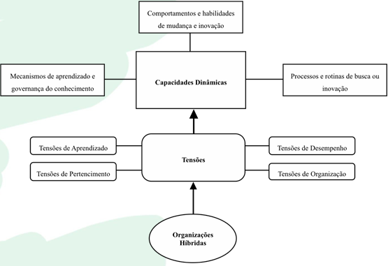 A partir das contribuições apontadas pelos autores Smith, Gonin e Besharov (2013) acerca das tensões organizacionais, e de Meirelles & Camargo (2014) sobre capacidades dinâmicas, apontamos neste artigo proposições que indicam as tensões organizacionais como impulsionadoras no desenvolvimento das capacidades dinâmicas em organizações híbridas.
