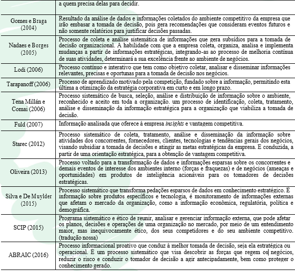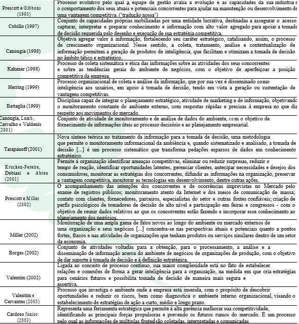 A Tabela 1 apresenta conceitos acerca da IC, baseados em Oliveira e Teles (2015) e Teixeira e Valentim (2016), adaptada e complementada pelos autores deste trabalho, de forma a mapear, ao longo do tempo, evoluções do termo no contexto empresarial.