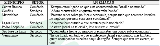 Além disso, verifica-se também que os entrevistados não se utilizam de fontes de informação mais formais e advindas de entidades de classe e/ou representativas dos seus setores de atuação, o que também compromete a coleta de informações mais bem elaboradas, ou produzidas a partir de estudos e